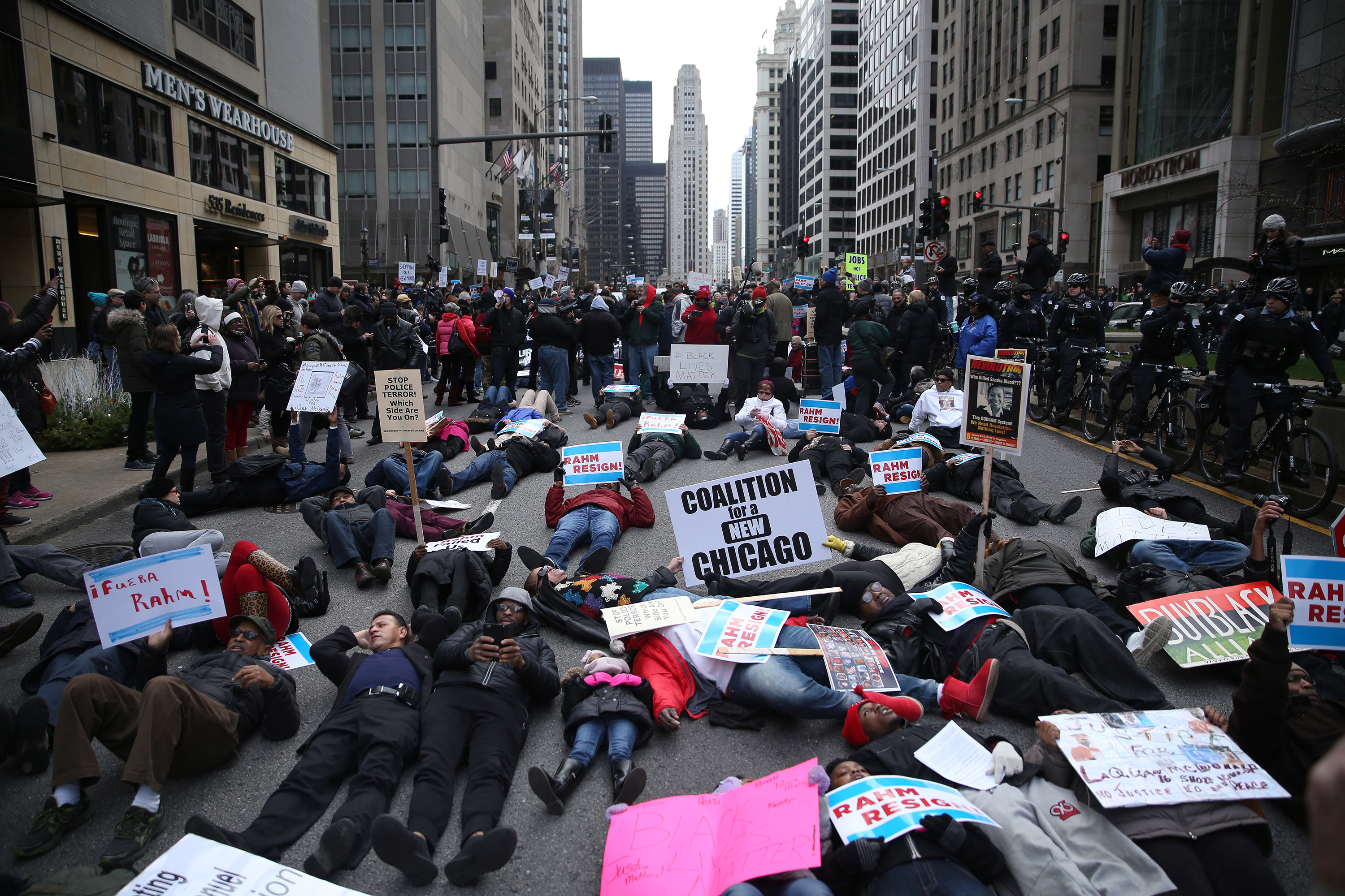 More than a hundred people marched along North Michigan Avenue on Thursday, holding “die-ins” in the street and blocking last-minute shoppers from stores as they staged a “Black Christmas” in response to the Laquan McDonald shooting.