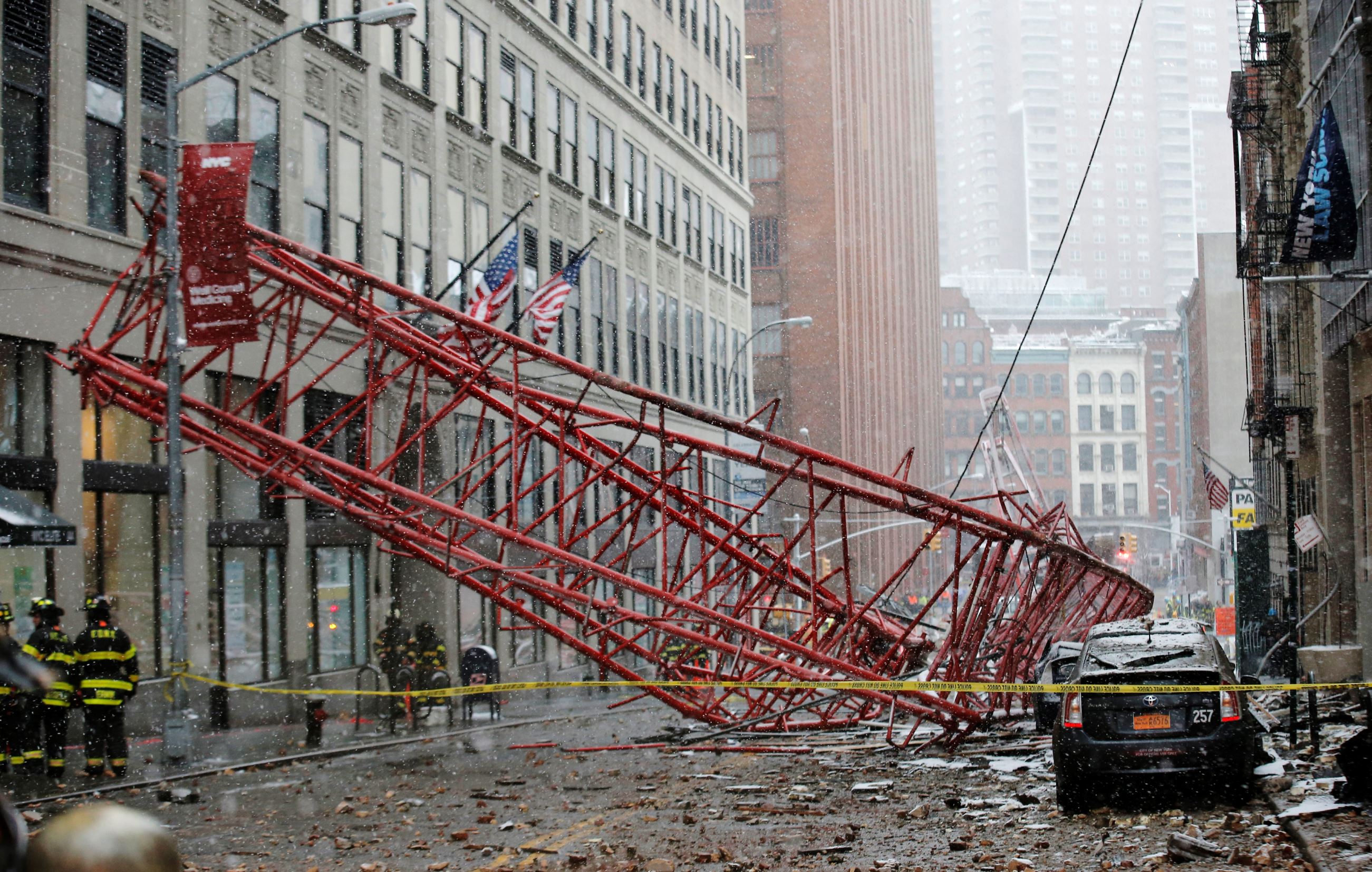 It may take weeks to determine why a huge construction crane that was being lowered during strong winds came crashing down onto a street, killing a pedestrian and crushing a row of parked cars, city officials said Saturday.